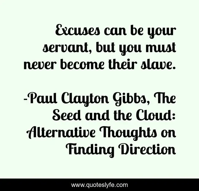 "Paul Clayton Gibbs, The Seed and the Cloud: Alternative Thoughts on Finding Direction Quotes." Quoteslyfe.com, 2025. Sun. 07 Dec. 2025. <https://www.quoteslyfe.com/quote/Excuses-can-be-your-servant-but-you-130304>.