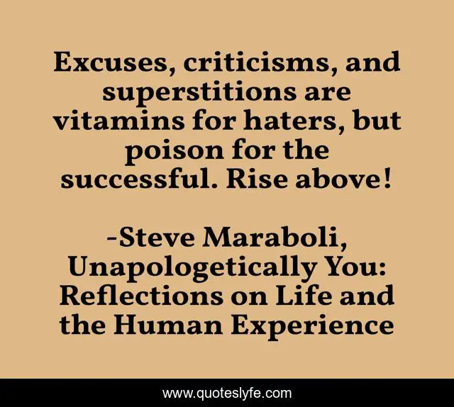 This page presents the quote "Excuses, criticisms, and superstitions are vitamins for haters, but poison for the successful. Rise above!". Author of this quote is Steve Maraboli, Unapologetically You: Reflections on Life and the Human Experience. This quote is about criticism, life, vitamins, success, superstition, excuses, haters,.