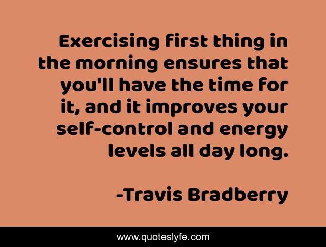 This page presents the quote "Exercising first thing in the morning ensures that you'll have the time for it, and it improves your self-control and energy levels all day long.". Author of this quote is Travis Bradberry. This quote is about day, long, time,.