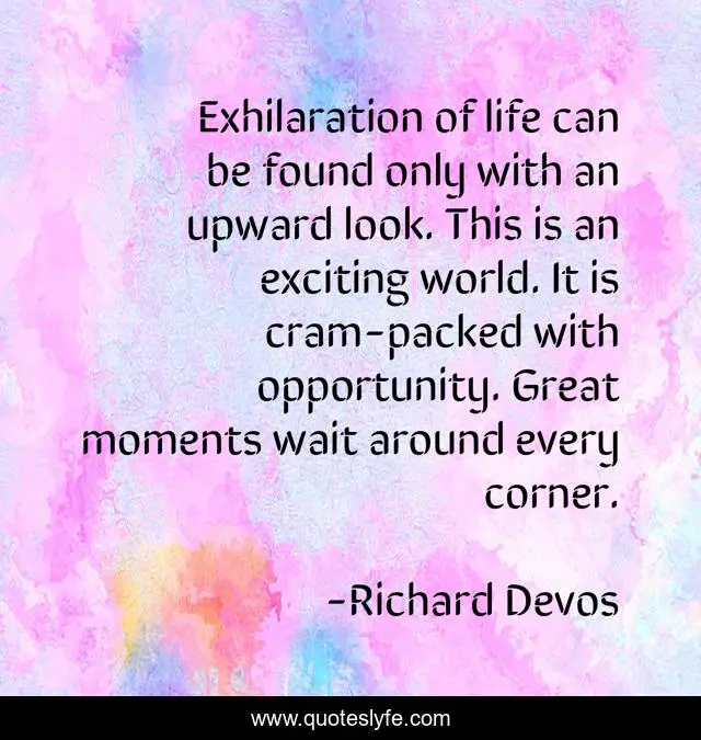 This page presents the quote "Exhilaration of life can be found only with an upward look. This is an exciting world. It is cram-packed with opportunity. Great moments wait around every corner.". Author of this quote is Richard Devos. .