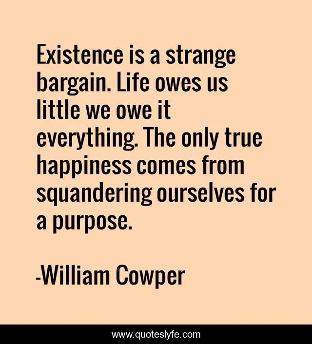 This page presents the quote "Existence is a strange bargain. Life owes us little we owe it everything. The only true happiness comes from squandering ourselves for a purpose.". Author of this quote is William Cowper. .
