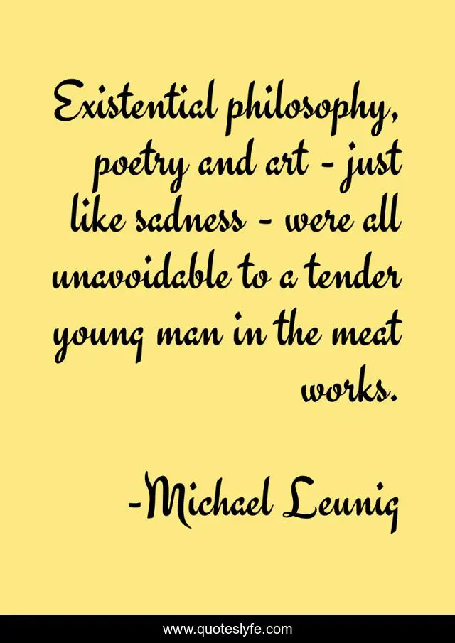 This page presents the quote "Existential philosophy, poetry and art - just like sadness - were all unavoidable to a tender young man in the meat works.". Author of this quote is Michael Leunig. This quote is about sadness, art, man,.