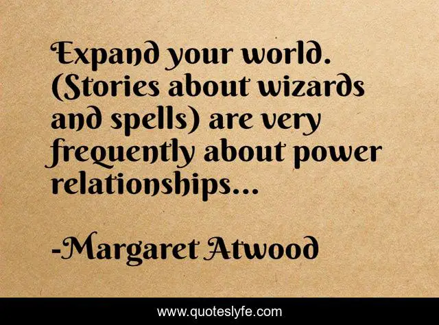 This page presents the quote "Expand your world. (Stories about wizards and spells) are very frequently about power relationships...". Author of this quote is Margaret Atwood. This quote is about fiction-writing, fantasy, science-fiction,.
