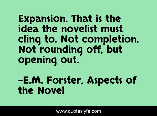 This page presents the quote "Expansion. That is the idea the novelist must cling to. Not completion. Not rounding off, but opening out.". Author of this quote is E.M. Forster, Aspects of the Novel. This quote is about creative-process, opening-up, expansion, writing,.