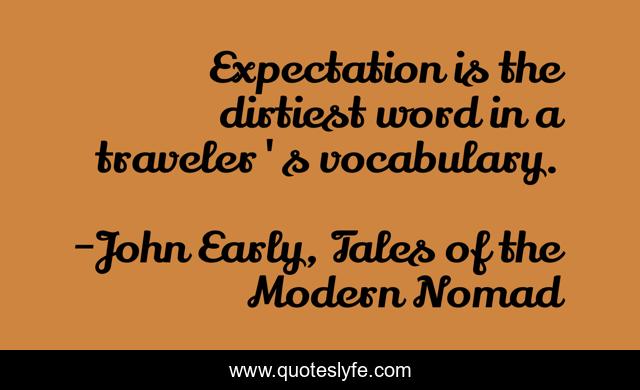 This page presents the quote "Expectation is the dirtiest word in a traveler's vocabulary.". Author of this quote is John Early, Tales of the Modern Nomad. This quote is about memoir, travel, travel-writing, adventure,.