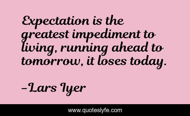 This page presents the quote "Expectation is the greatest impediment to living, running ahead to tomorrow, it loses today.". Author of this quote is Lars Iyer. .