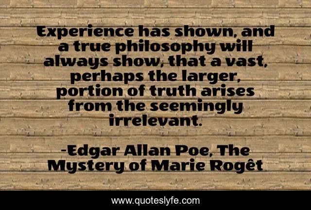 This page presents the quote "Experience has shown, and a true philosophy will always show, that a vast, perhaps the larger, portion of truth arises from the seemingly irrelevant.". Author of this quote is Edgar Allan Poe, The Mystery of Marie Rogêt. This quote is about relevance, life, philosophy, irrelevance, truth,.
