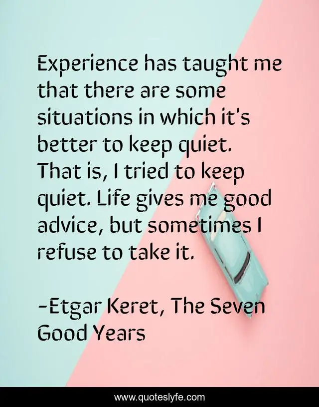 This page presents the quote "Experience has taught me that there are some situations in which it's better to keep quiet. That is, I tried to keep quiet. Life gives me good advice, but sometimes I refuse to take it.". Author of this quote is Etgar Keret, The Seven Good Years. This quote is about self-advice, life, self-knowledge, advice, experience, talking, self, silence,.