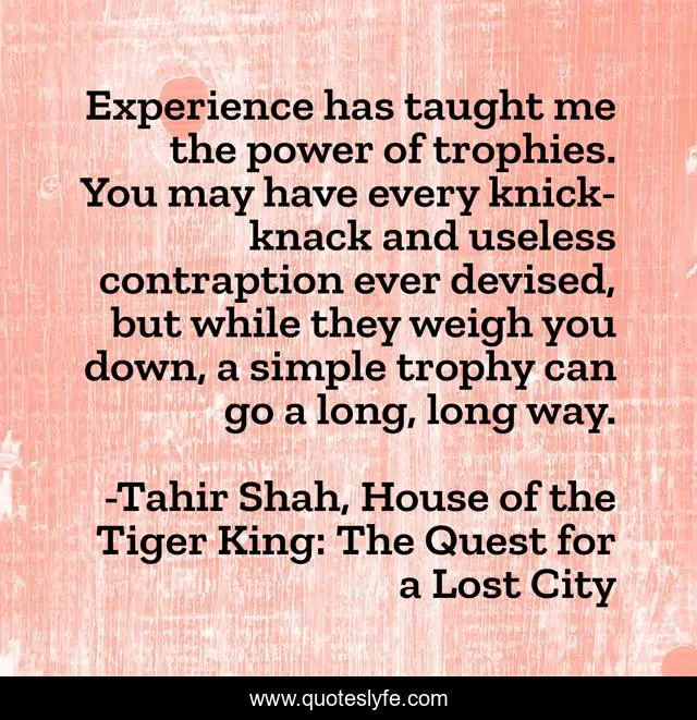 This page presents the quote "Experience has taught me the power of trophies. You may have every knick-knack and useless contraption ever devised, but while they weigh you down, a simple trophy can go a long, long way.". Author of this quote is Tahir Shah, House of the Tiger King: The Quest for a Lost City. This quote is about trophy, power,.