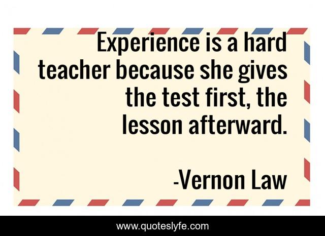 This page presents the quote "Experience is a hard teacher because she gives the test first, the lesson afterward.". Author of this quote is Vernon Law. This quote is about test, she, experience,.