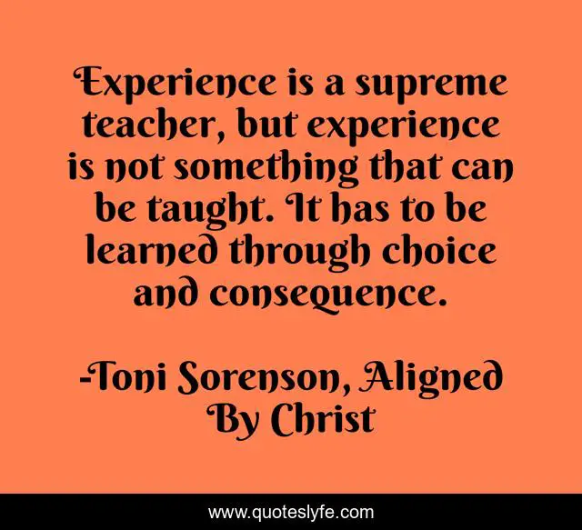 This page presents the quote "Experience is a supreme teacher, but experience is not something that can be taught. It has to be learned through choice and consequence.". Author of this quote is Toni Sorenson, Aligned By Christ. This quote is about life, choice, consequences, experience, inspiration,.