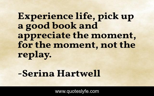 This page presents the quote "Experience life, pick up a good book and appreciate the moment, for the moment, not the replay.". Author of this quote is Serina Hartwell. This quote is about life, read, experience, moment, book, replay, reading, film,.