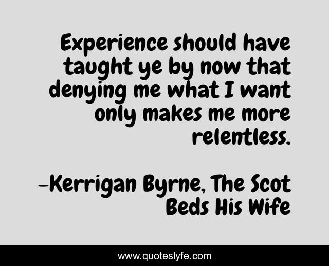 This page presents the quote "Experience should have taught ye by now that denying me what I want only makes me more relentless.". Author of this quote is Kerrigan Byrne, The Scot Beds His Wife. This quote is about highlander-romance, wild-west, historical-romance,.