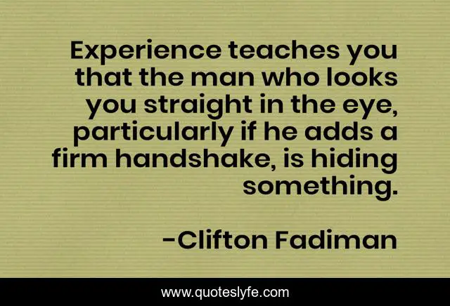 This page presents the quote "Experience teaches you that the man who looks you straight in the eye, particularly if he adds a firm handshake, is hiding something.". Author of this quote is Clifton Fadiman. This quote is about eye, man,.