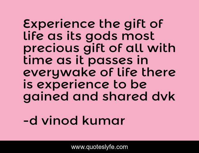 This page presents the quote "Experience the gift of life as its gods most precious gift of all with time as it passes in everywake of life there is experience to be gained and shared dvk". Author of this quote is d vinod kumar. This quote is about smile, happiness,.