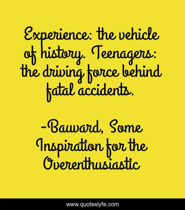 This page presents the quote "Experience: the vehicle of history. Teenagers: the driving force behind fatal accidents.". Author of this quote is Bauvard, Some Inspiration for the Overenthusiastic. This quote is about cars, teenagers, experience, history,.