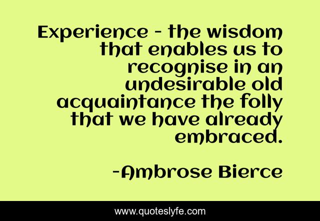 This page presents the quote "Experience - the wisdom that enables us to recognise in an undesirable old acquaintance the folly that we have already embraced.". Author of this quote is Ambrose Bierce. This quote is about folly, old, wisdom,.