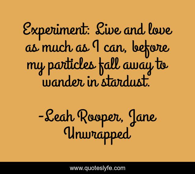 This page presents the quote "Experiment: Live and love as much as I can, before my particles fall away to wander in stardust.". Author of this quote is Leah Rooper, Jane Unwrapped. This quote is about egyptian-gods, egyptian-mythology, egyptian, egypt, young-adult-paranormal-romance, kate-rooper, jane-unwrapped, leah-rooper, young-adult-romance,.