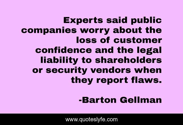 This page presents the quote "Experts said public companies worry about the loss of customer confidence and the legal liability to shareholders or security vendors when they report flaws.". Author of this quote is Barton Gellman. This quote is about loss, confidence, worry,.
