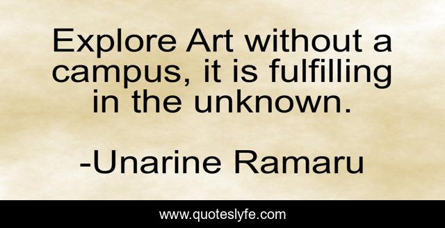 This page presents the quote "Explore Art without a campus, it is fulfilling in the unknown.". Author of this quote is Unarine Ramaru. This quote is about art, culture, unknown, finding-yourself, self-realization, exploration, fulfillment,.