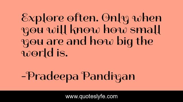 This page presents the quote "Explore often. Only when you will know how small you are and how big the world is.". Author of this quote is Pradeepa Pandiyan. This quote is about life, love, big, travel, drive, highways, explore, enthusiasm, inspirational,.
