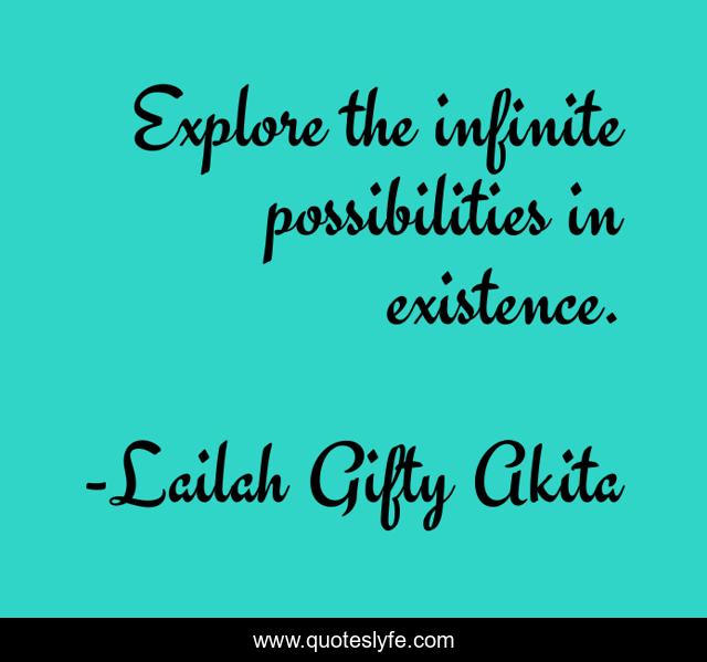 This page presents the quote "Explore the infinite possibilities in existence.". Author of this quote is Lailah Gifty Akita. This quote is about possibilities, life, self-determination, positive, motivational, confidence, wisdom-of-lailah-gifty-akita, explore, optimistic,.