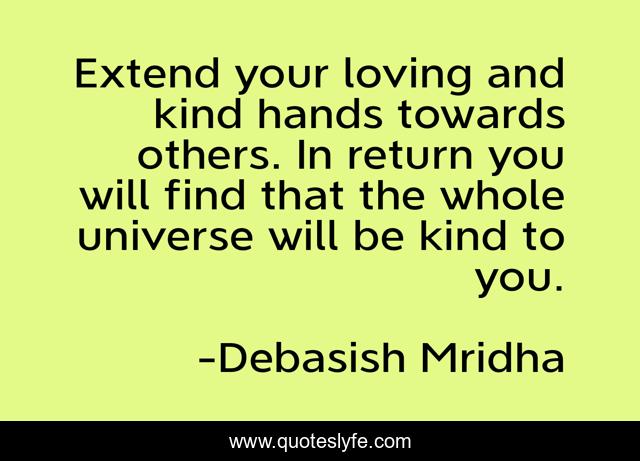 This page presents the quote "Extend your loving and kind hands towards others. In return you will find that the whole universe will be kind to you.". Author of this quote is Debasish Mridha. This quote is about kind, debasish, mridha, philosophy, debasish-mridha, hand, extend-your-loving-hands, universe, will-be-kind-to-you,.