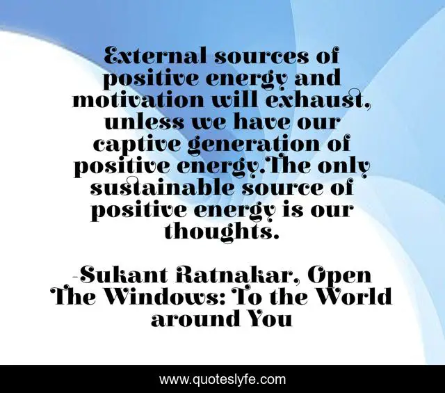 "Sukant Ratnakar, Open The Windows: To the World around You Quotes." Quoteslyfe.com, 2025. Tue. 09 Dec. 2025. <https://www.quoteslyfe.com/quote/External-sources-of-positive-energy-and-motivation-138193>.