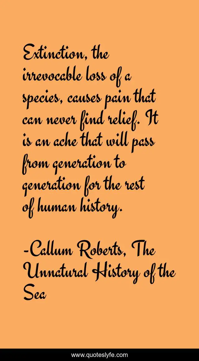 This page presents the quote "Extinction, the irrevocable loss of a species, causes pain that can never find relief. It is an ache that will pass from generation to generation for the rest of human history.". Author of this quote is Callum Roberts, The Unnatural History of the Sea. This quote is about environment, environmental-conservation, oceans, environmental-degradation, environmentalism,.