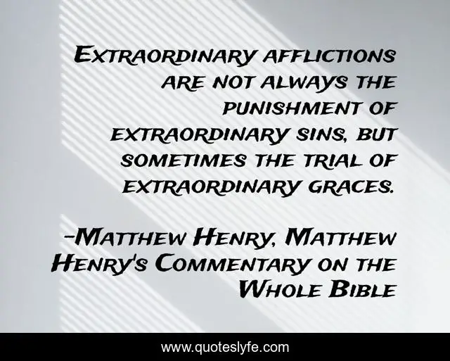 This page presents the quote "Extraordinary afflictions are not always the punishment of extraordinary sins, but sometimes the trial of extraordinary graces.". Author of this quote is Matthew Henry, Matthew Henry's Commentary on the Whole Bible. This quote is about faith, grace, affliction,.
