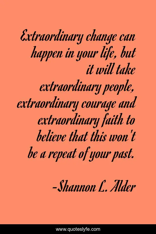 This page presents the quote "Extraordinary change can happen in your life, but it will take extraordinary people, extraordinary courage and extraordinary faith to believe that this won't be a repeat of your past.". Author of this quote is Shannon L. Alder. This quote is about faith, doing-the-extraordinary, hard-work, living, rise-up, past, no-ordinary-moments, exciting-life, excitement,.