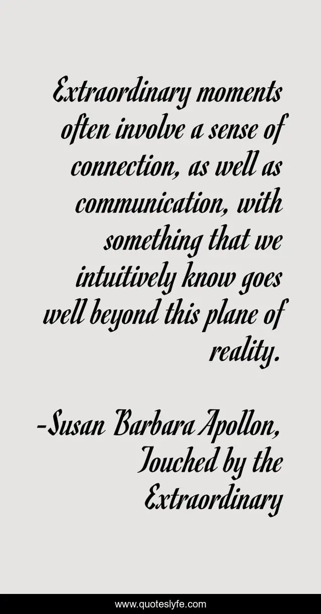 This page presents the quote "Extraordinary moments often involve a sense of connection, as well as communication, with something that we intuitively know goes well beyond this plane of reality.". Author of this quote is Susan Barbara Apollon, Touched by the Extraordinary. This quote is about intuition, healing-insights, synchronicity,.