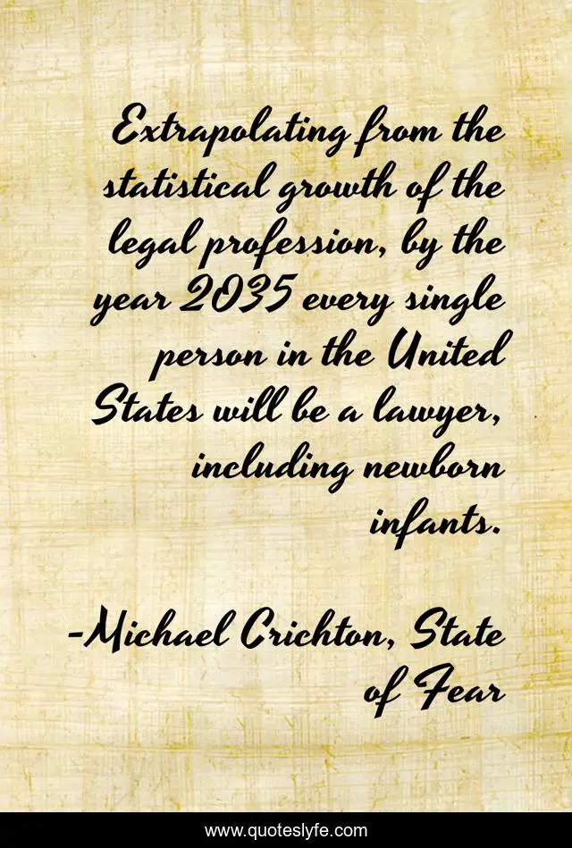 This page presents the quote "Extrapolating from the statistical growth of the legal profession, by the year 2035 every single person in the United States will be a lawyer, including newborn infants.". Author of this quote is Michael Crichton, State of Fear. .