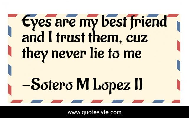 This page presents the quote "Eyes are my best friend and I trust them, cuz they never lie to me". Author of this quote is Sotero M Lopez II. This quote is about trustworthy, eyes, trust, trustworthiness,.