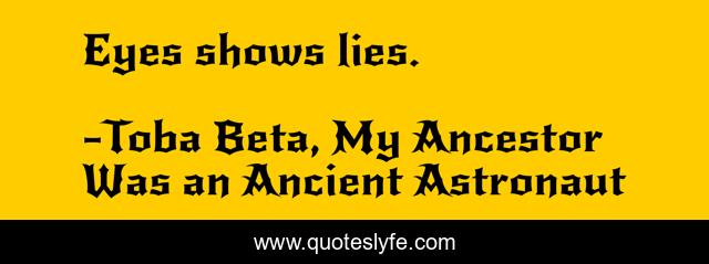 This page presents the quote "Eyes shows lies.". Author of this quote is Toba Beta, My Ancestor Was an Ancient Astronaut. This quote is about lies, eyes, truth,.
