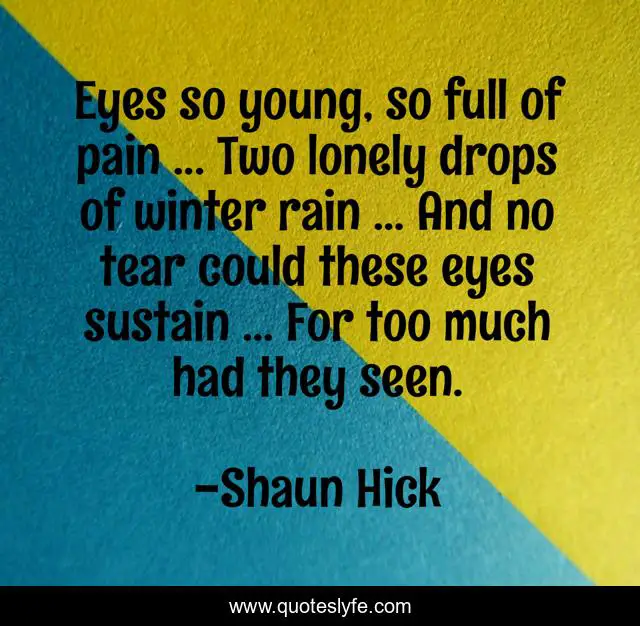 This page presents the quote "Eyes so young, so full of pain ... Two lonely drops of winter rain ... And no tear could these eyes sustain ... For too much had they seen.". Author of this quote is Shaun Hick. This quote is about scared, winter-rain, sad, girl, eyes, heartache, eye, winter, sad-childhood,.