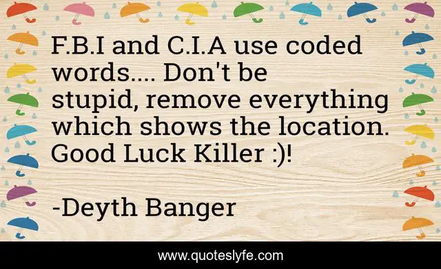 This page presents the quote "F.B.I and C.I.A use coded words.... Don't be stupid, remove everything which shows the location. Good Luck Killer :)!". Author of this quote is Deyth Banger. This quote is about cia, good, killer, stupid, location, don-t, fbi, luck,.