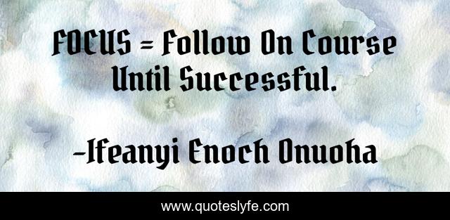 This page presents the quote "FOCUS = Follow On Course Until Successful.". Author of this quote is Ifeanyi Enoch Onuoha. This quote is about success, successful, advice, accomplishment, focus, wisdom, course, ifeanyi-enoch-onuoha, leadership,.