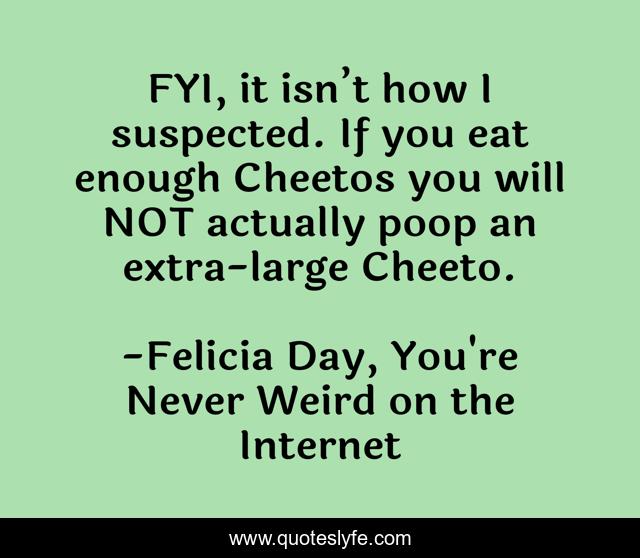 This page presents the quote "FYI, it isn’t how I suspected. If you eat enough Cheetos you will NOT actually poop an extra-large Cheeto.". Author of this quote is Felicia Day, You're Never Weird on the Internet. This quote is about life-tips, life-philosophy, food-for-thought, life-lessons,.