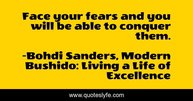 This page presents the quote "Face your fears and you will be able to conquer them.". Author of this quote is Bohdi Sanders, Modern Bushido: Living a Life of Excellence. This quote is about overcoming-fears, fears, bohdi-sanders, courage-in-life, courage, overcoming-fear, fear, overcoming-obstacles,.