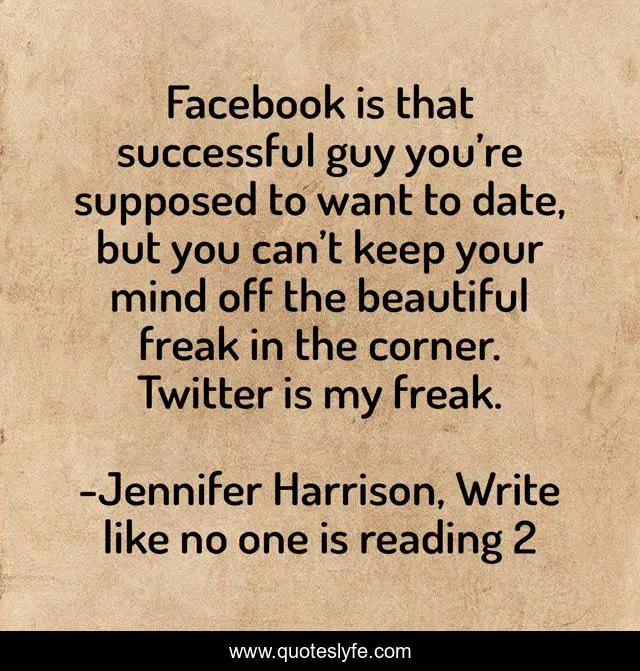 This page presents the quote "Facebook is that successful guy you’re supposed to want to date, but you can’t keep your mind off the beautiful freak in the corner. Twitter is my freak.". Author of this quote is Jennifer Harrison, Write like no one is reading 2. This quote is about freak, successful, sarcasm, irony, facebook, weird, dating, guys, twitter,.
