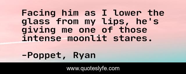 This page presents the quote "Facing him as I lower the glass from my lips, he's giving me one of those intense moonlit stares.". Author of this quote is Poppet, Ryan. This quote is about paranormal-romance, vampire-romance,.
