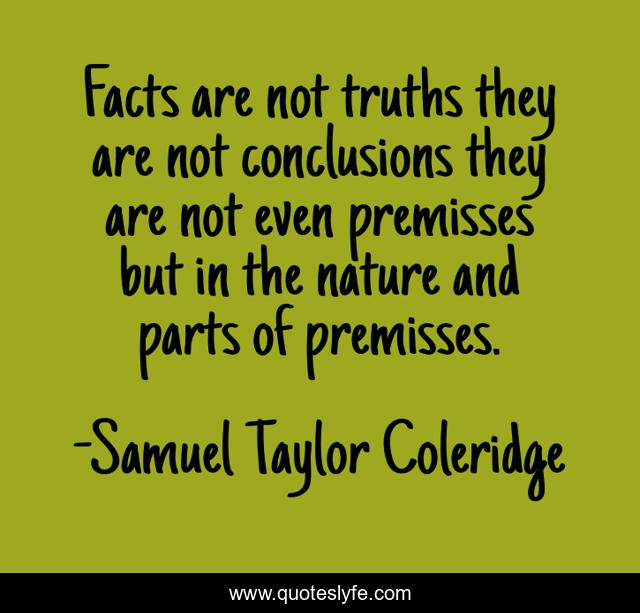 This page presents the quote "Facts are not truths they are not conclusions they are not even premisses but in the nature and parts of premisses.". Author of this quote is Samuel Taylor Coleridge. .