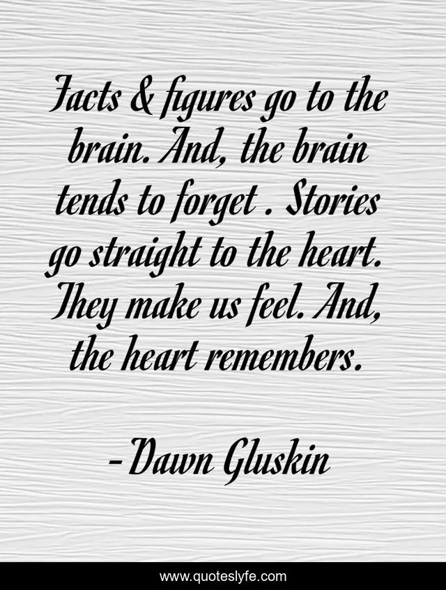 This page presents the quote "Facts & figures go to the brain. And, the brain tends to forget . Stories go straight to the heart. They make us feel. And, the heart remembers.". Author of this quote is Dawn Gluskin. This quote is about storytelling, feelings,.