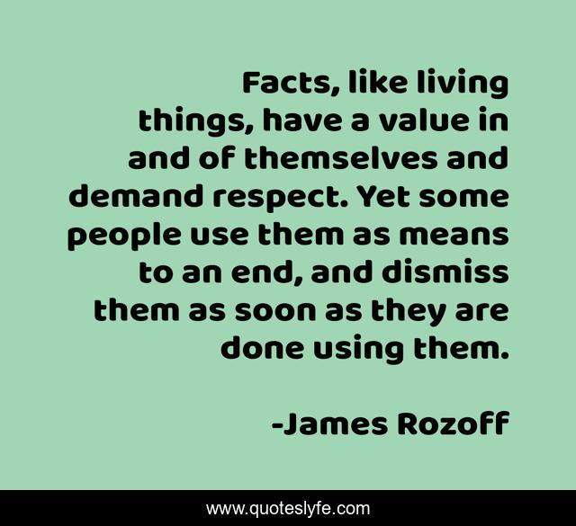 This page presents the quote "Facts, like living things, have a value in and of themselves and demand respect. Yet some people use them as means to an end, and dismiss them as soon as they are done using them.". Author of this quote is James Rozoff. This quote is about facts, truth,.