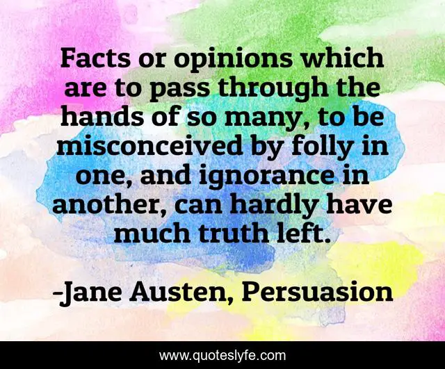 This page presents the quote "Facts or opinions which are to pass through the hands of so many, to be misconceived by folly in one, and ignorance in another, can hardly have much truth left.". Author of this quote is Jane Austen, Persuasion. This quote is about ignorance, knowledge,.