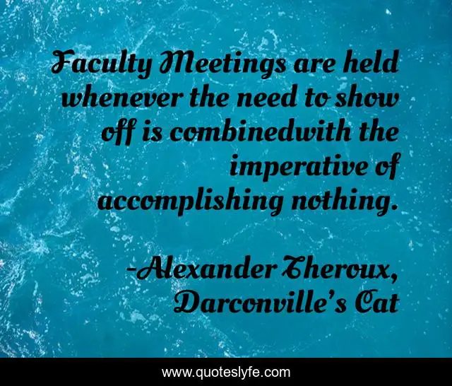 This page presents the quote "Faculty Meetings are held whenever the need to show off is combinedwith the imperative of accomplishing nothing.". Author of this quote is Alexander Theroux, Darconville’s Cat. This quote is about funny, comedy,.