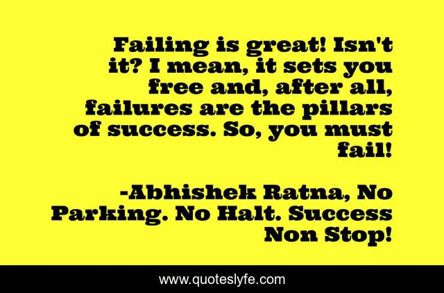 This page presents the quote "Failing is great! Isn't it? I mean, it sets you free and, after all, failures are the pillars of success. So, you must fail!". Author of this quote is Abhishek Ratna, No Parking. No Halt. Success Non Stop!. This quote is about failure-and-attitude, success, failure-success, failing, failure, success-strategies, failure-and-success,.