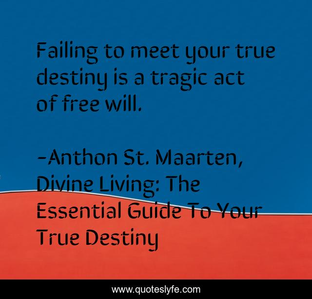 This page presents the quote "Failing to meet your true destiny is a tragic act of free will.". Author of this quote is Anthon St. Maarten, Divine Living: The Essential Guide To Your True Destiny. This quote is about choices-and-consequences, destiny, free-will, soul-purpose, fate-destiny, fulfillment, inspirational, life-philosophy, enthusiasm,.