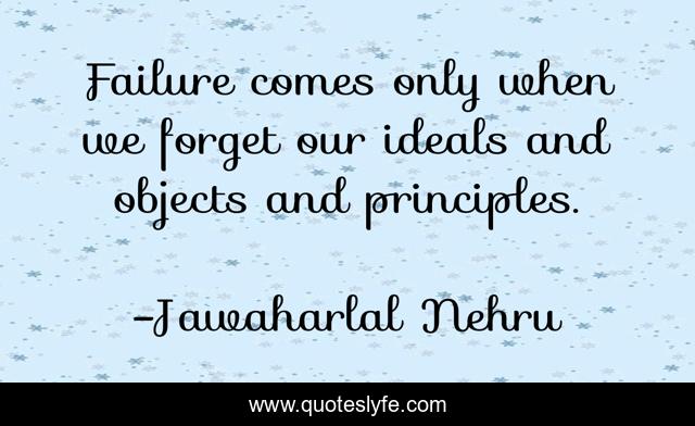This page presents the quote "Failure comes only when we forget our ideals and objects and principles.". Author of this quote is Jawaharlal Nehru. This quote is about failures, mistakes,.
